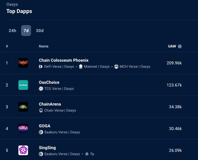 Oasysのゲームタイトルは、DappRadarのランキングで顕著な成果を収めており、特に「Chain Colosseum Phoenix」や「OasChoice」がトップ10にランクインしています。