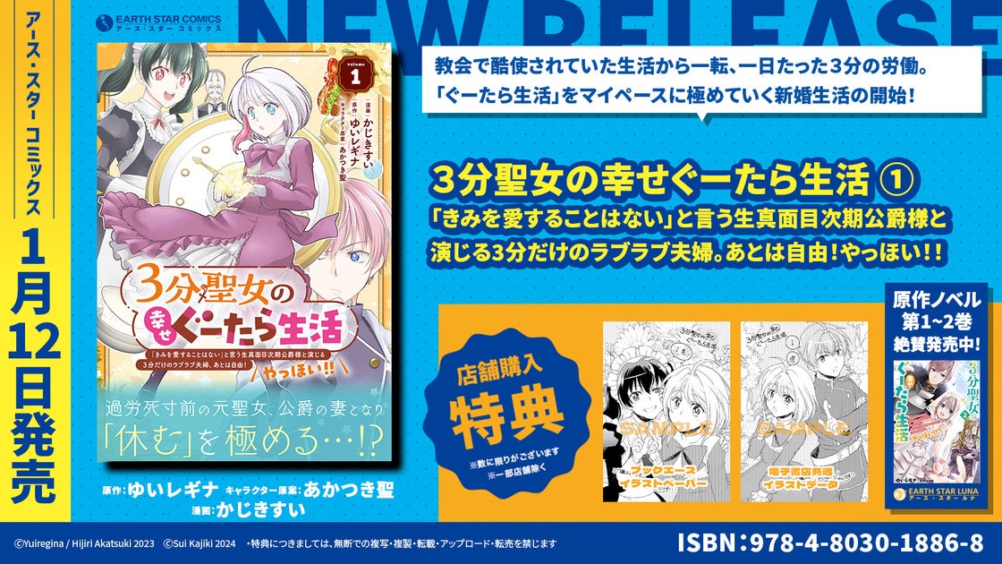 株式会社アース・スター エンターテイメントのコミックレーベル、アース・スター コミックスから、人気作品『3分聖女の幸せぐーたら生活』の第1巻が1月12日に発売されます。