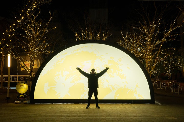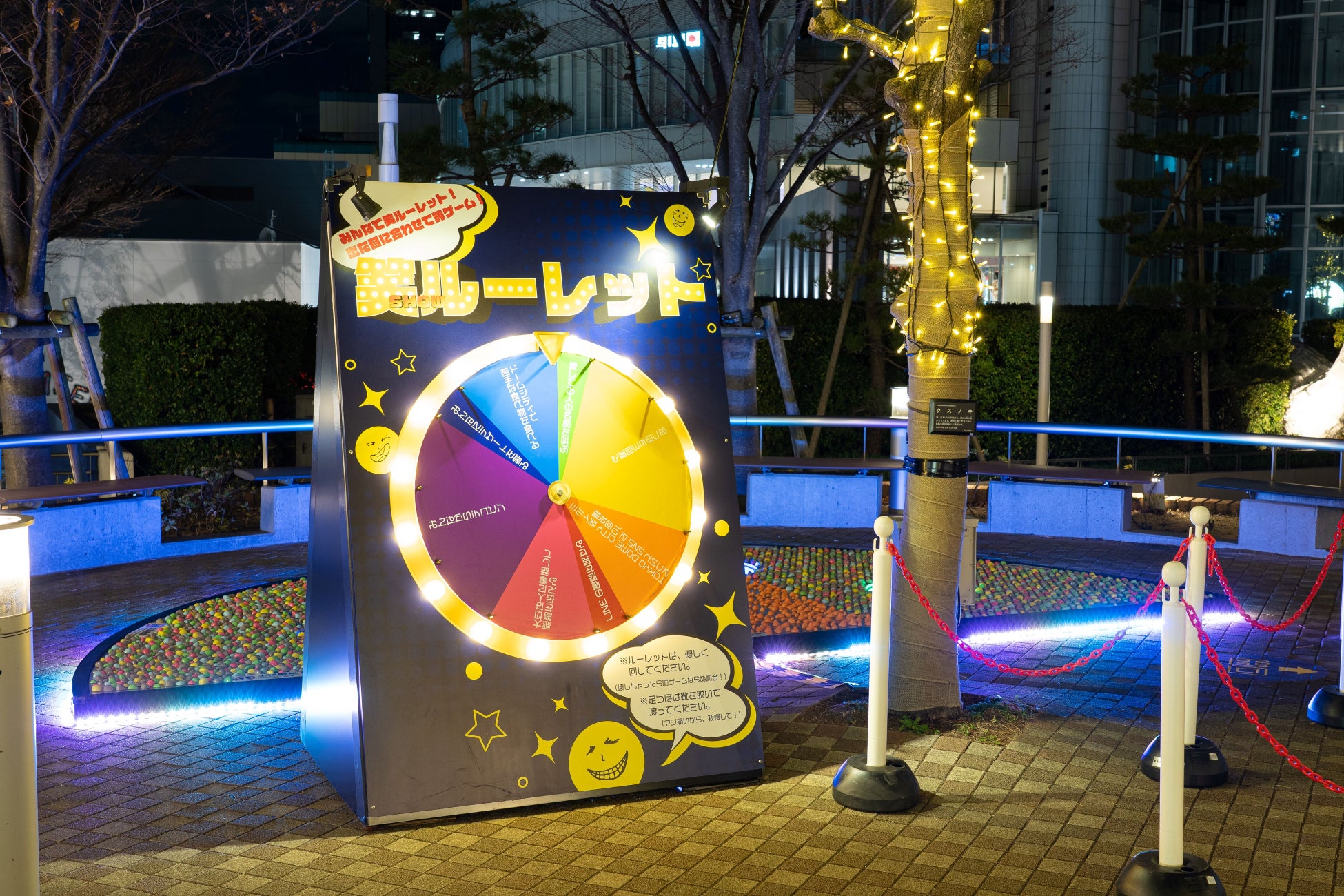 体験イルミでは、半月のオブジェや罰ゲームルーレットなど、体を動かして楽しめる展示があります。