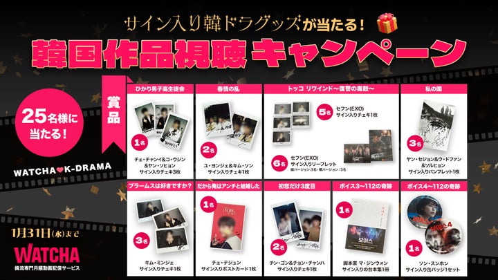 キャンペーン期間中にWATCHAで2作品以上を視聴すると、抽選で25名に人気韓国俳優や作家のサイン入り韓ドラグッズがプレゼントされます。