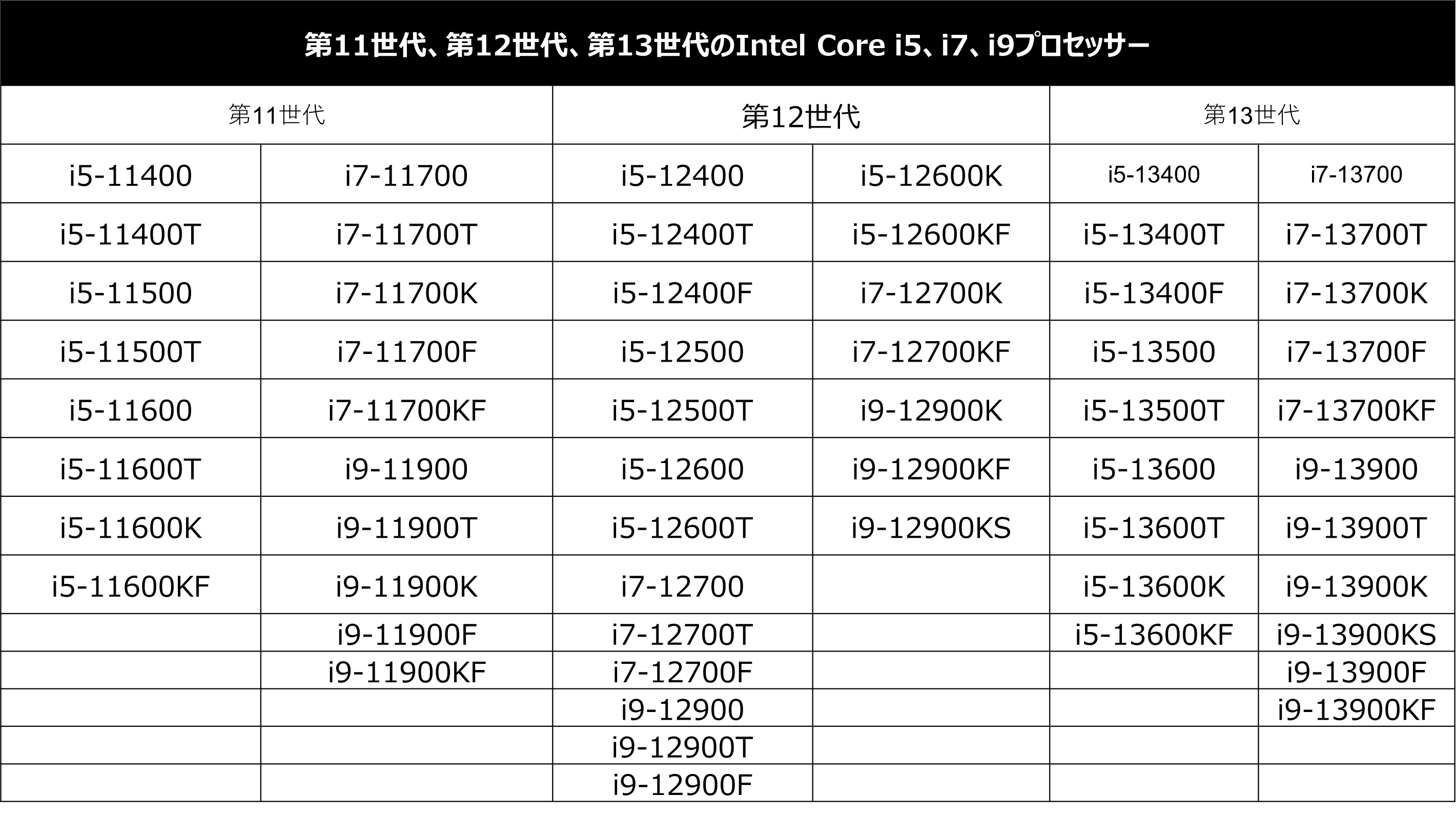 第11世代、第12世代、第13世代のIntel Core i5、i7、i9プロセッサー