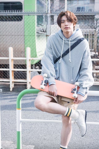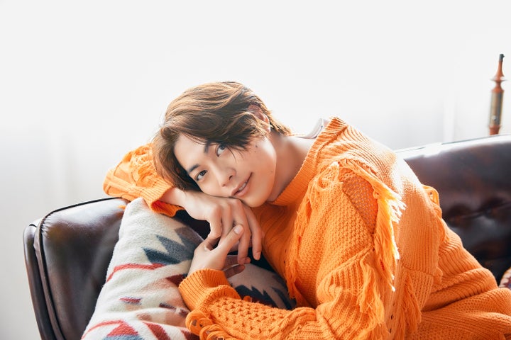 温かみのあるオレンジ色のニットやストリートスタイルなど、彼の個性が表現されています。