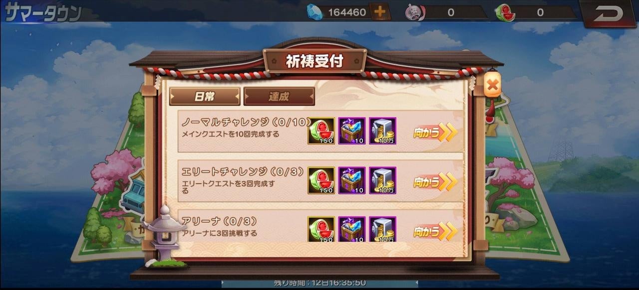 チャレンジモードは、毎日【10:00~22:00】の間、無制限で挑戦可能です。このモードでは、いくつかのレベルクエストが用意されており、ハートダイヤを獲得することで次のクエストに進むことができます。また、タイマーとポイントが蓄積されていき、タイマー終了時のポイントで毎日のランキングが決定、スイカコインなどの報酬をゲットできます!