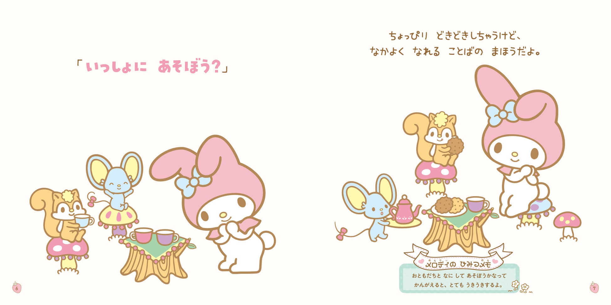 マイメロディがどのように声をかけるのか、お友達と一緒に遊びたいときなど、言葉にしていく様子が描かれています。