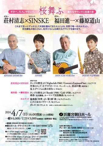 株式会社DOと株式会社MUNIQUEは、4月7日に東京都中央区の浜離宮朝日ホールで、ギタリストの荘村清志と福田進一、尺八奏者の藤原道山とマリンバ奏者のSINSKEによるコンサートを開催します。