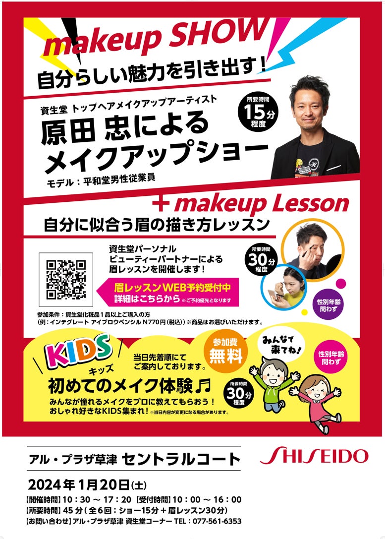 眉の描き方レッスンやメンズメイクデモンストレーションなど、資生堂パーソナルビューティーパートナーやトップヘアメイクアップアーティストの原田忠氏による特別なプログラムが行われます。