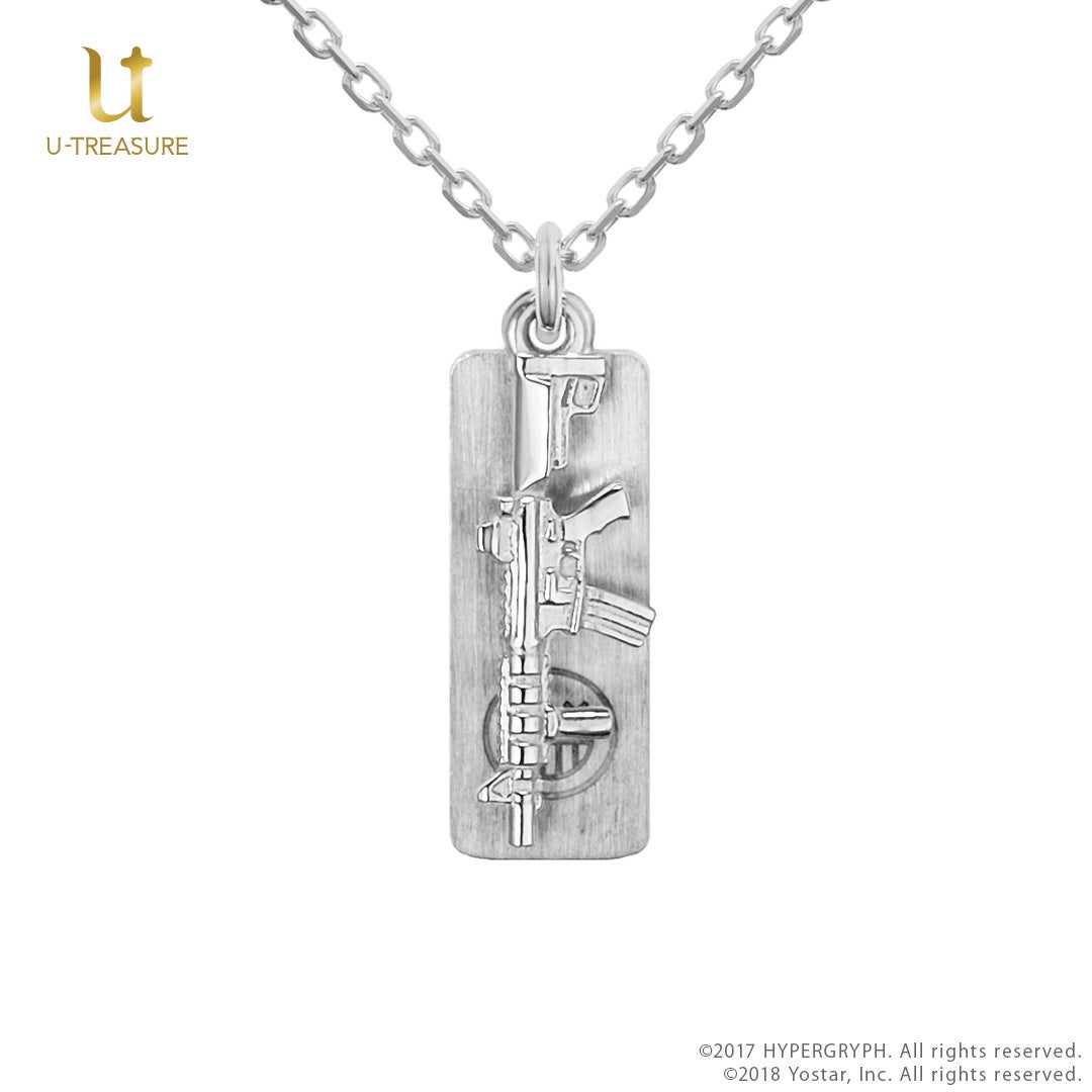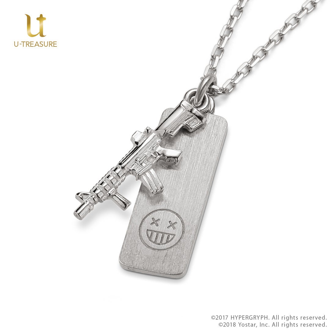 この新作は、テキサス、エリジウム、Wの3種類のモチーフネックレスで、武器や衣装のデザインをチャームに落とし込み、エンブレムやスキルアイコンが刻まれたプレートにセットされています。