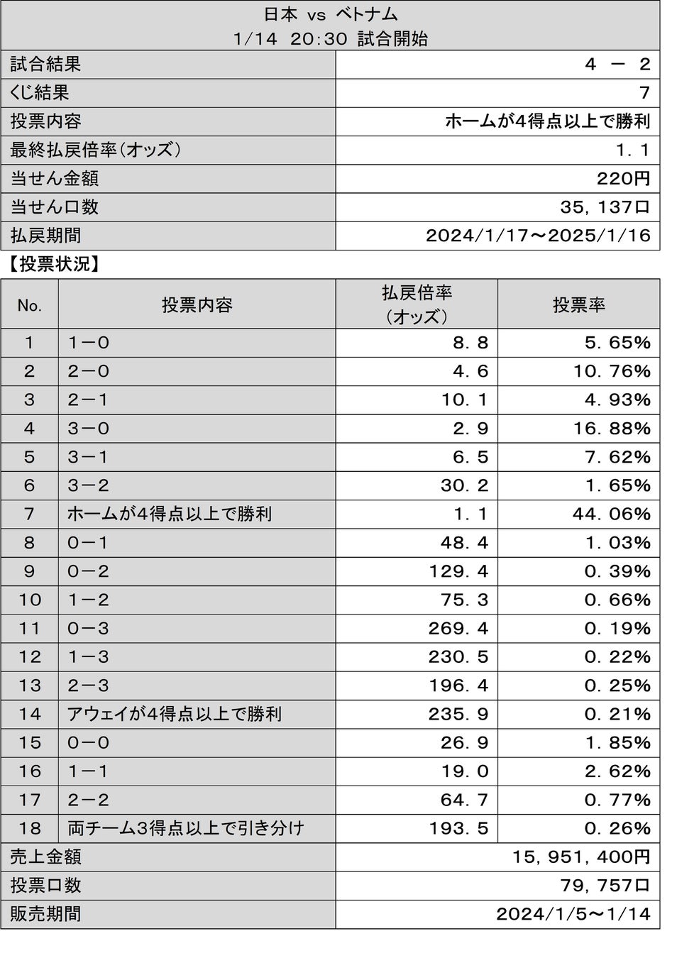 - 日本代表初戦のくじ結果は42で日本勝利、払戻倍率は1.1倍、当せん金額は220円