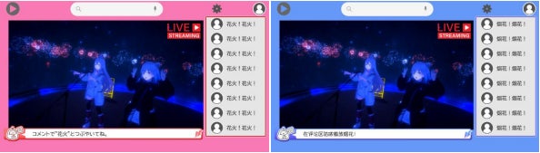 配信サイトの「コメント」や「投げ銭」などの機能と連携することで、バーチャル空間の演出をインタラクティブに行えます。例えば、日本と中国の動画配信サイトにバーチャルライブを同時生配信してそれぞれの言語で応援コメントを入れると、リアルタイムに花火が打ち上がるなど、さまざまな国の人が参加しながらライブを楽しむことが可能です。また演出表現は、コンテンツの世界観に合わせて柔軟な対応が可能です
