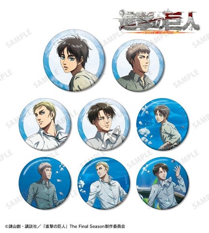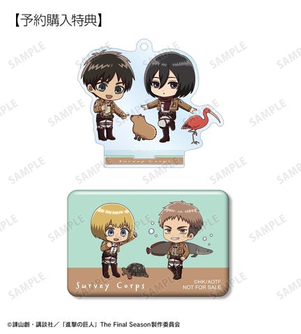 エレン、ジャン、エルヴィン、リヴァイの描き下ろしイラストを使用したトレーディングアクリルカードやネームプレート、缶バッジなど、日常で使えるキャラクターグッズを展開しています。