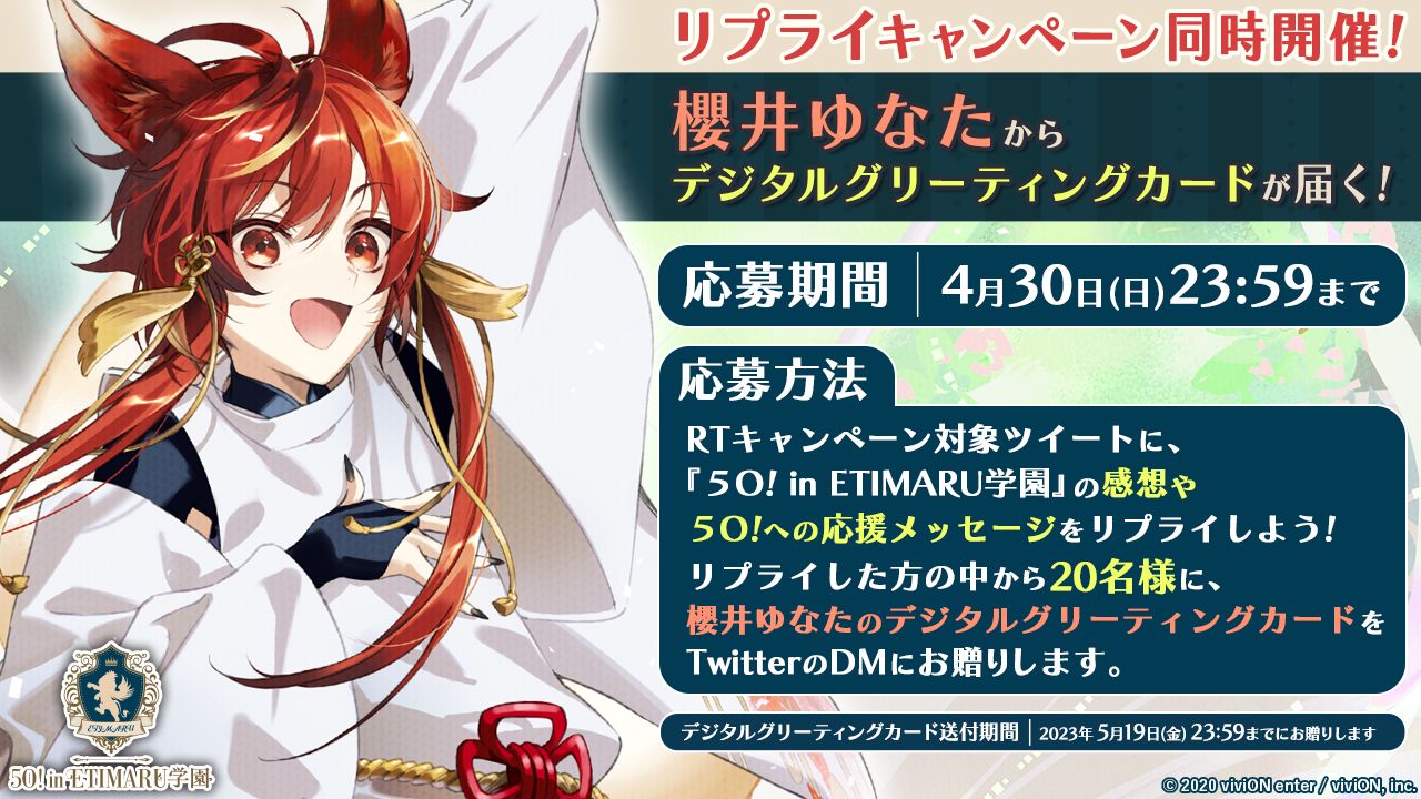 2.キャンペーン対象ツイートに『5O! in ETIMARU学園』の感想や「5O!」への応援メッセージをリプライ