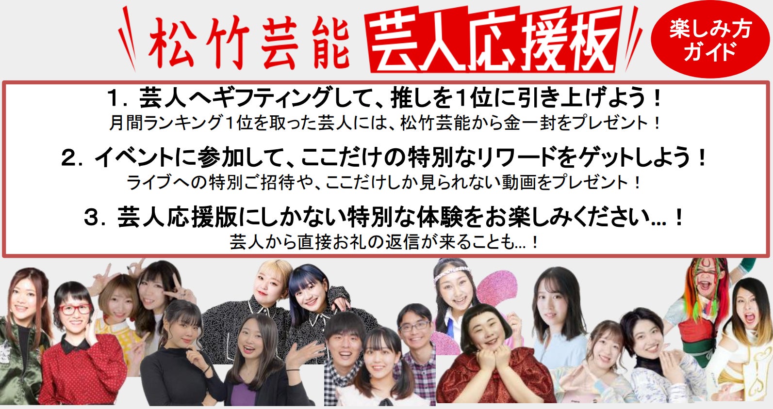 このサービスでは、松竹芸能所属の若手芸人10組が様々な企画でコンテンツを提供し、ギフティングを通じて芸人を応援することができます。