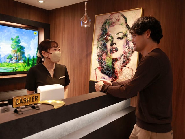 - マリリンモンロー風の受付とおしゃれなカフェの雰囲気