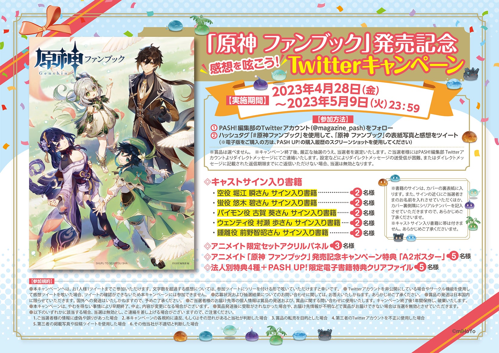 「原神 ファンブック」の発売を記念して、Twitterで本書の感想を呟いてくれた方の中から抽選で、声優陣のサイン入り書籍などが当たるキャンペーンを実施中!ぜひ感想を呟いてください!!