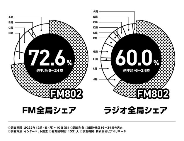 - FM802は2023年12月4日(月)~10日(日)に行われた「ビデオリサーチ関西圏ラジオ聴取率調査」で、全日平均の6:00~24:00において、首位を獲得しました。