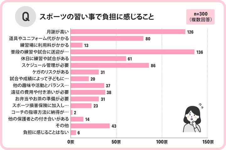 一方、負担になることとしては、「普段の練習や試合に送迎が必要」という回答が最も多く、スケジュール管理も負担とされました。