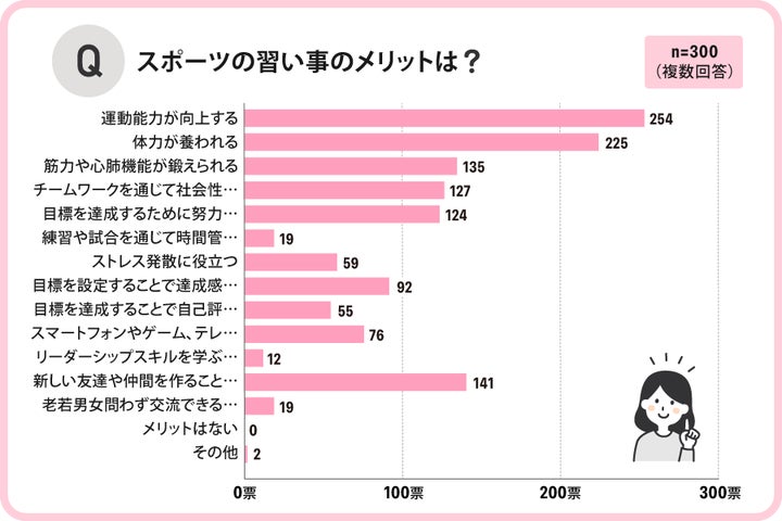 スポーツの習い事のメリットについては、「運動能力が向上する」「体力が養われる」という回答が多かったです。