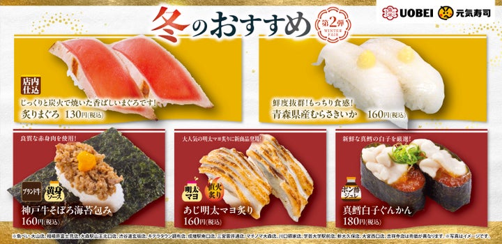 また、冬のおすすめ商品として、炙りまぐろ、青森県産むらさきいか、神戸牛そぼろ海苔包み、あじ明太マヨ炙り、真鱈白子ぐんかんなども提供されます。