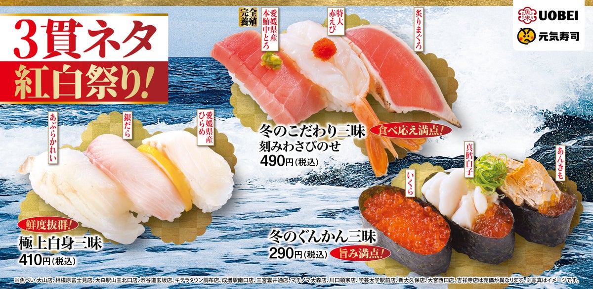 2024年1月16日から2月13日まで、全国の魚べい・元気寿司で「3貫ネタ紅白祭り!」が開催されます。
