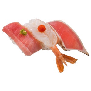 冬のこだわり三昧は、愛媛県産の本鮪中とろ、特大赤えび、炙りまぐろの3貫で構成されています。