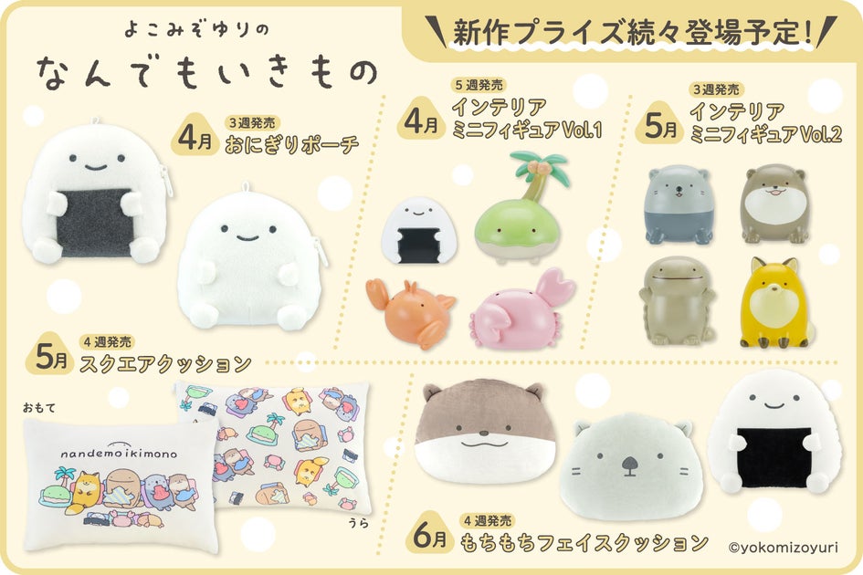 具体的な景品ラインナップには、おにぎりポーチやインテリアミニフィギュア、スクエアクッション、もちもちフェイスクッションなどがあります。