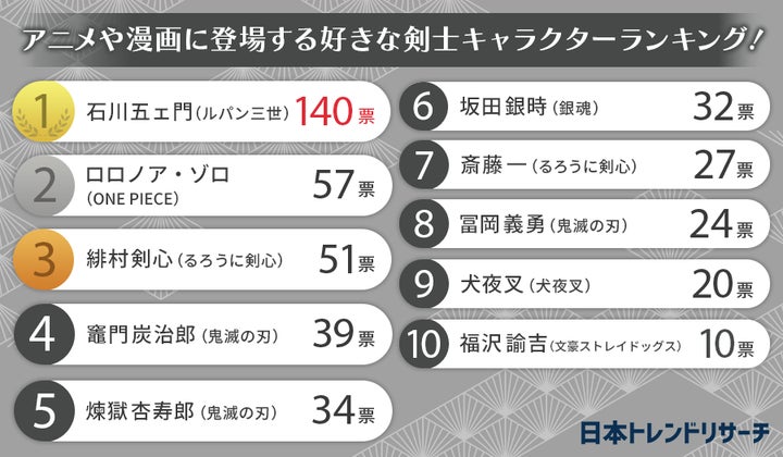 「アニメや漫画の剣士キャラクターランキング」の結果が発表されました。