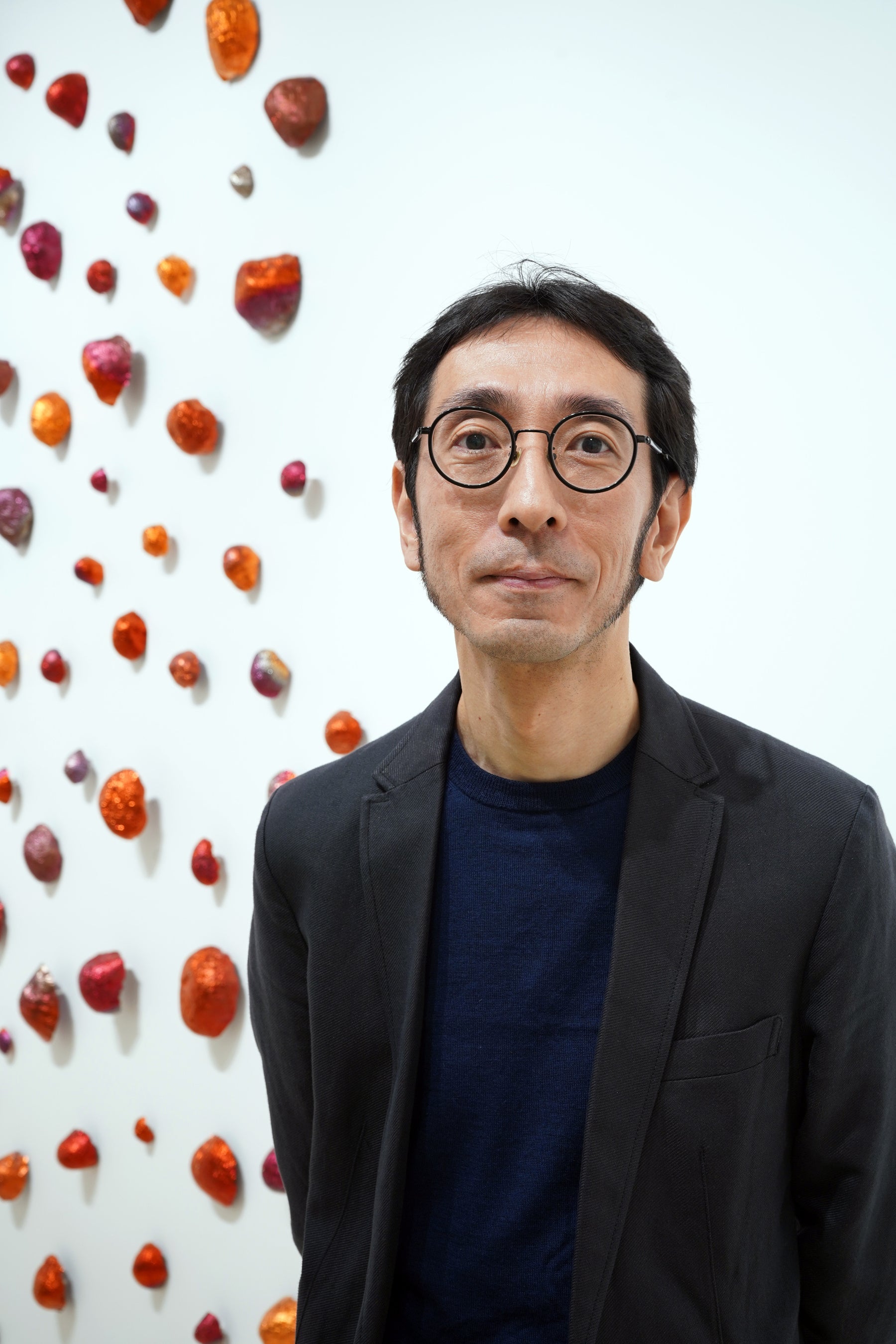 また、「境の石 凸に凹」では、球体状のワイヤーに凹面を向けた銅箔が並び、石の表面の形状や時間の経過を表現しています。