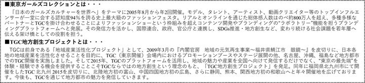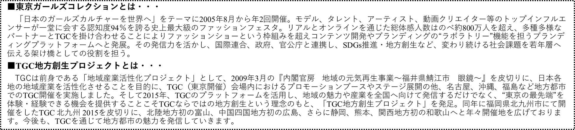 - TGCは地方創生プロジェクトで、地域の魅力や産業を発信する