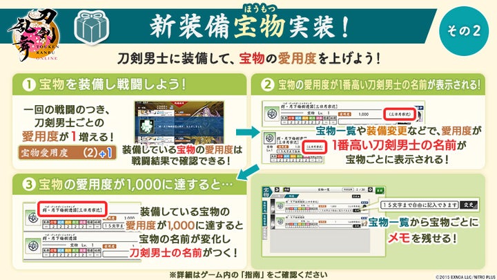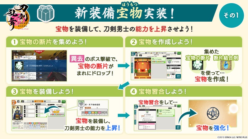 また、宝物の装備によって刀剣男士の能力が向上し、宝物の作成には断片と結合剤が必要です。