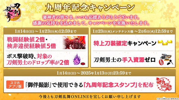 九周年を祝うご挨拶や特別なイラストも追加され、九周年記念キャンペーンやログインプレゼントも開催されます。