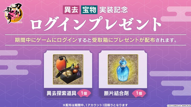 さらに、異去と宝物の実装を記念してログインプレゼントがあります。