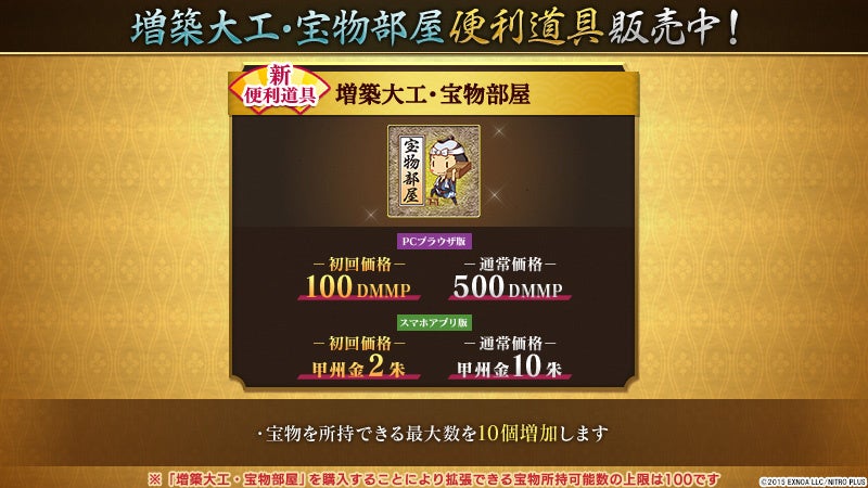宝物所持可能数は30個で、増築大工・宝物部屋を購入すると10個増やすことができます。