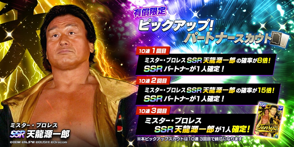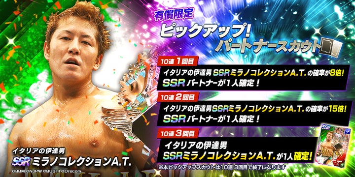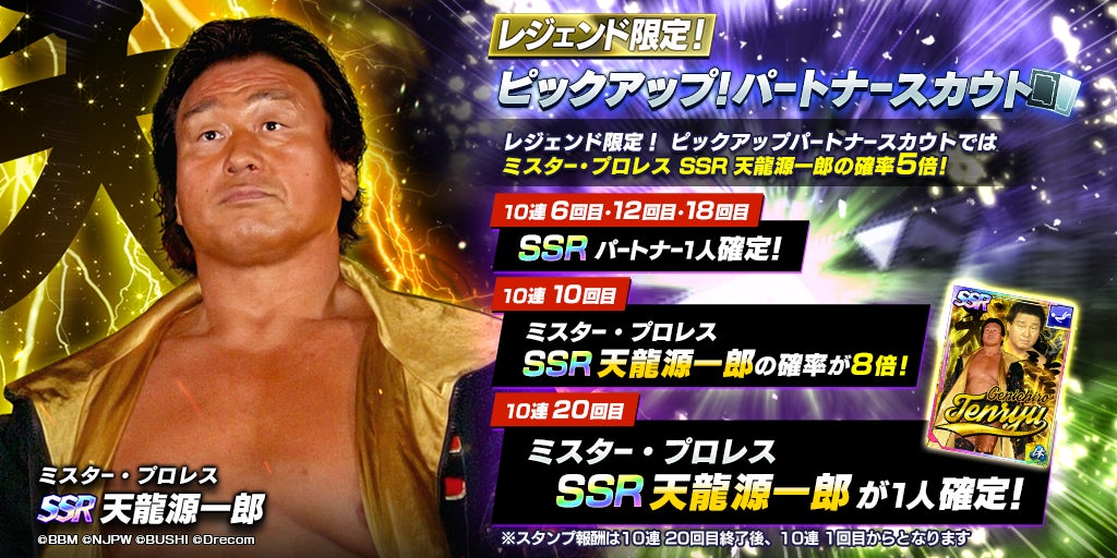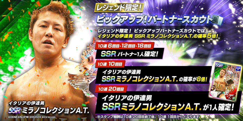 また、SSR天龍源一郎やSSRミラノコレクションA.T.も登場するレジェンド限定ピックアップパートナースカウトも同時に開催されています。