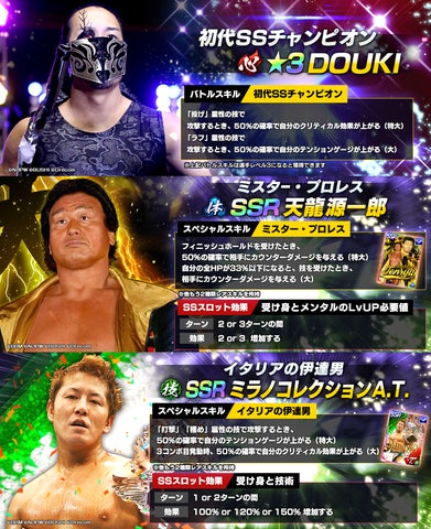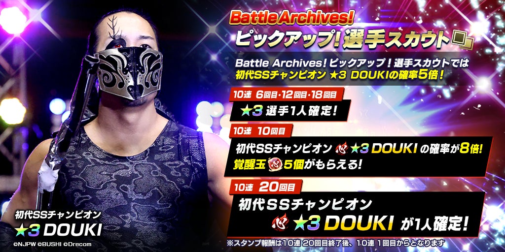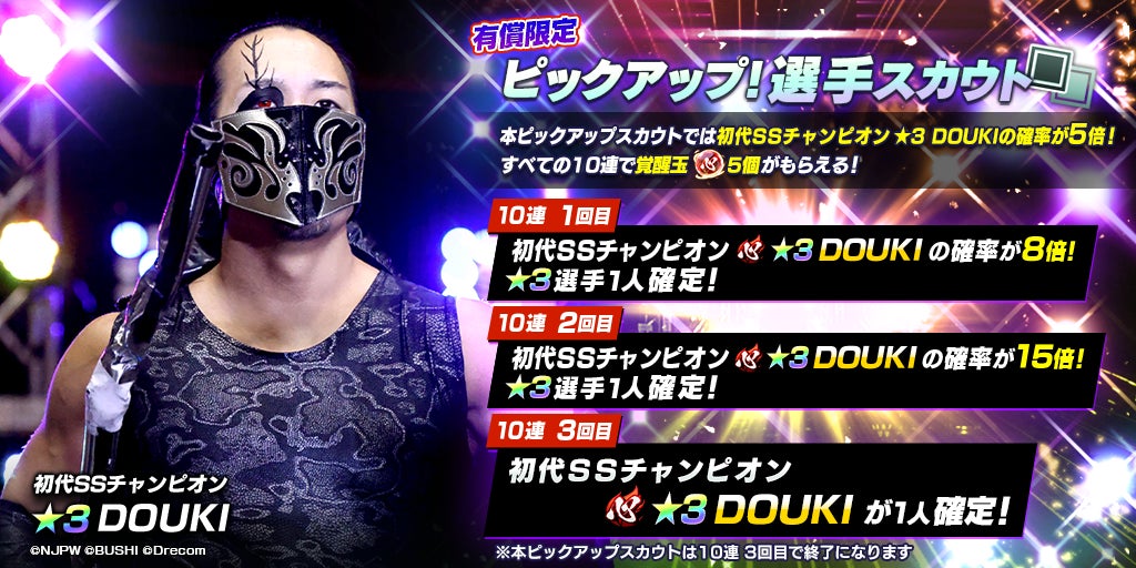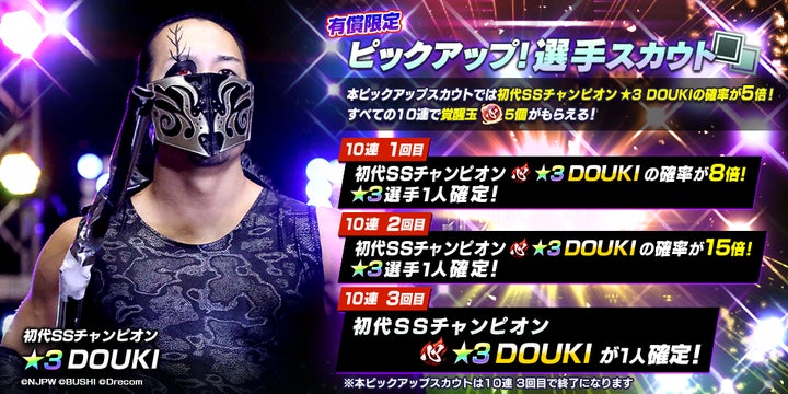 2024年1月17日(水)から、新日本プロレスのゲーム「新日SS」では、新たな育成選手として初代SSチャンピオンの★3DOUKIをピックアップする「Battle Archives!ピックアップ!選手スカウト」が開催されています。