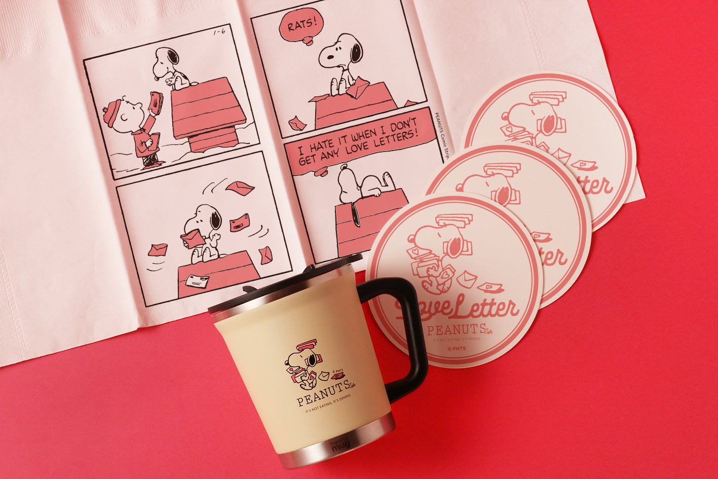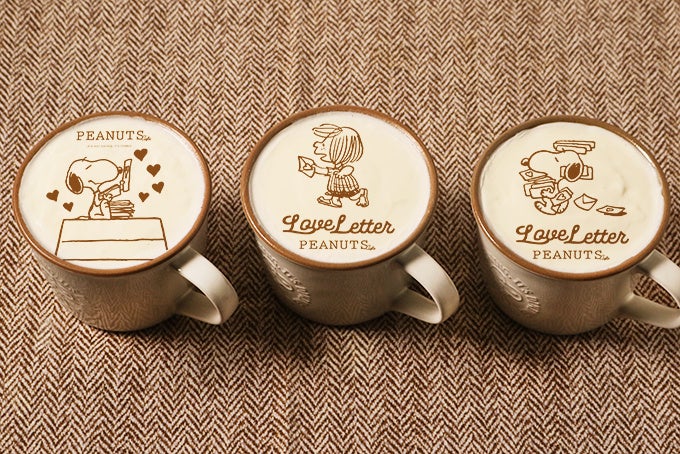 - ホイップココア with ピンクプレッツェル、スヌーピーのラブレターパイケーキ、スヌーピーのスイートチョコレートフォンデュ、Love Letter ラテアート、Love Letter ガトーショコラ、ティータイムセット、チョコマシュマロ、焼きショコラ、コースター、テーブルペーパー、ダブルマグ、アクリルカードスタンドセット