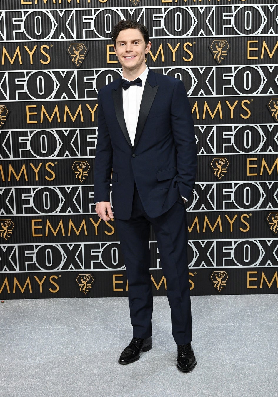 エヴァン・ピーターズは、ネイビーウールとシルクのタキシードにホワイトコットンシャツを合わせ、ネイビーシルクのボウタイとブラックレザーシューズでスタイリッシュに着こなしました。