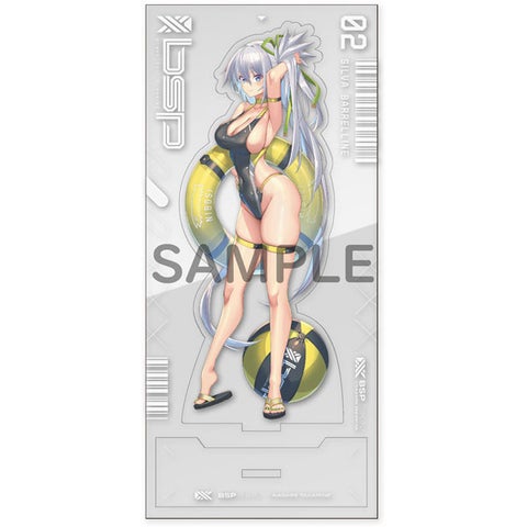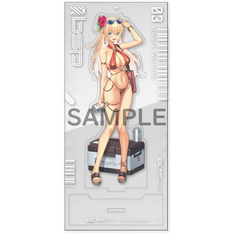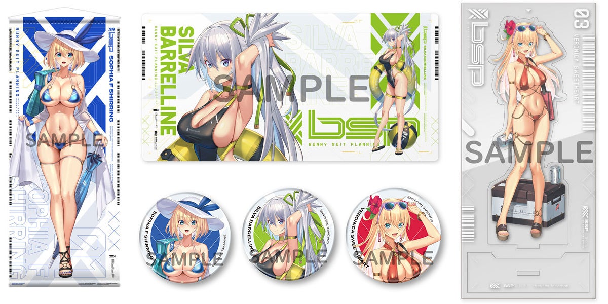 - グッズには「ほぼ等身大タペストリー」「ラバーデスクマット」「缶バッジ」「アクリルスタンド」があり、セクシーなスイムスーツ姿のキャラクターが魅力