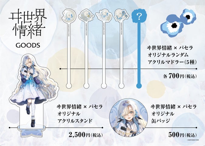 - 販売グッズとしてヰ世界情緒×パセラオリジナルマドラーやアクリススタンド、缶バッジが販売される。