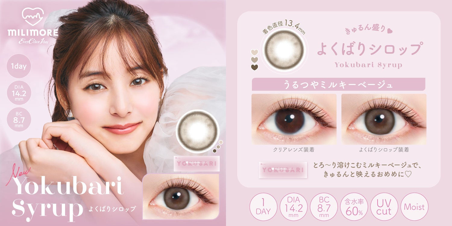 - 「よくばりシロップ」は、黒目さんもしっかり発色するミルキーベージュのカラーコンタクト