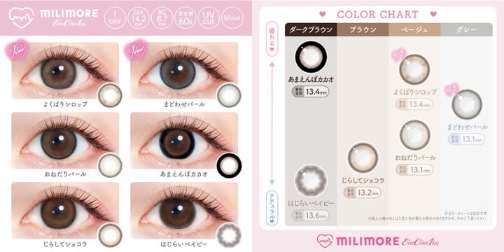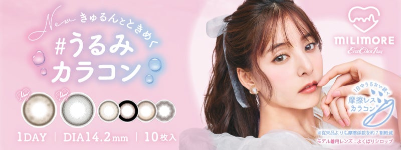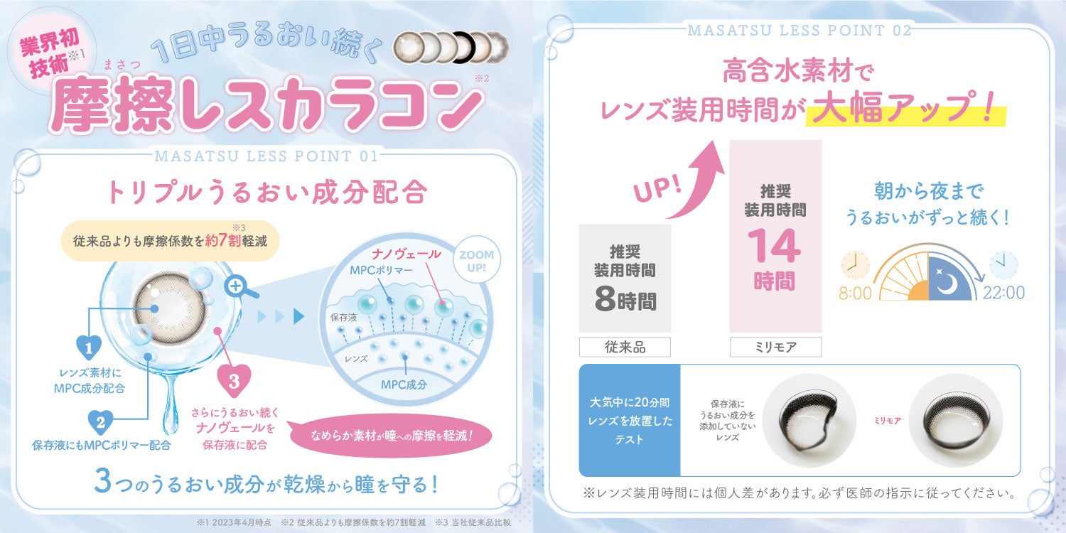 - ミリモアシリーズは、摩擦レスカラコン技術を採用し、瞳を保護し、装用時間がアップ