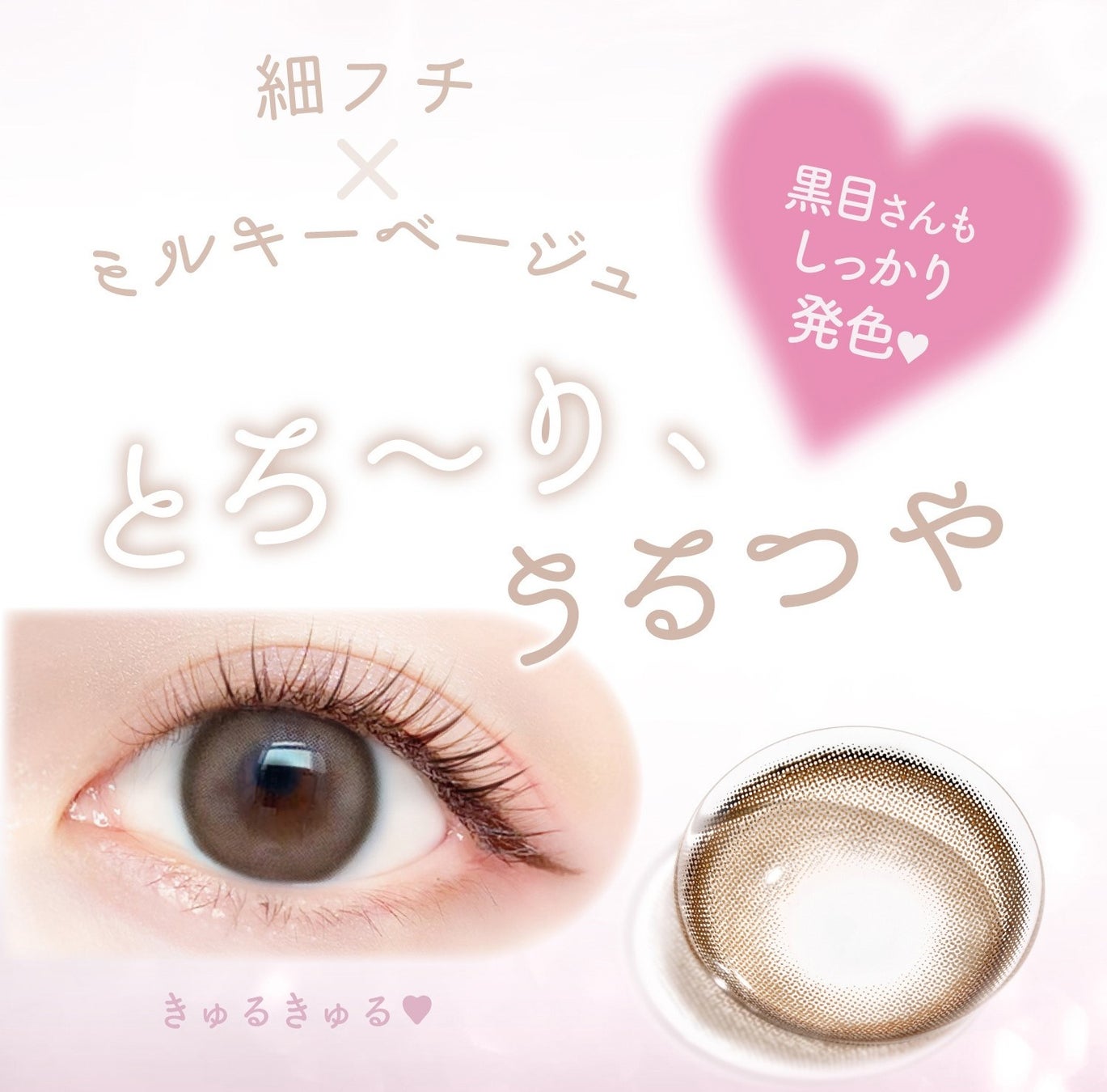 - ミルキーベージュ、細フチデザイン、摩擦レスカラコン、トリプルうるおい成分、高含水素材、ノベルティキャンペーン、カラーコンタクトブランド