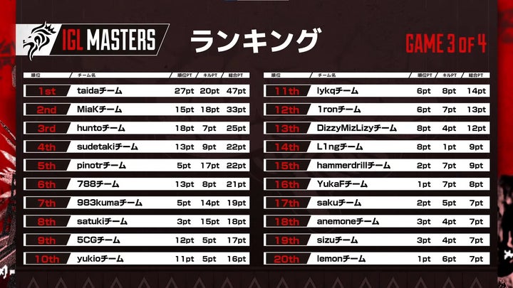 各試合ごとに順位ポイントとキルポイントが与えられ、総合ポイント順で優勝チームが決まります。