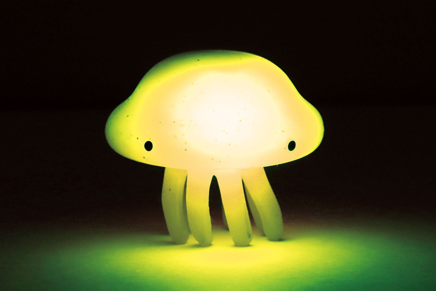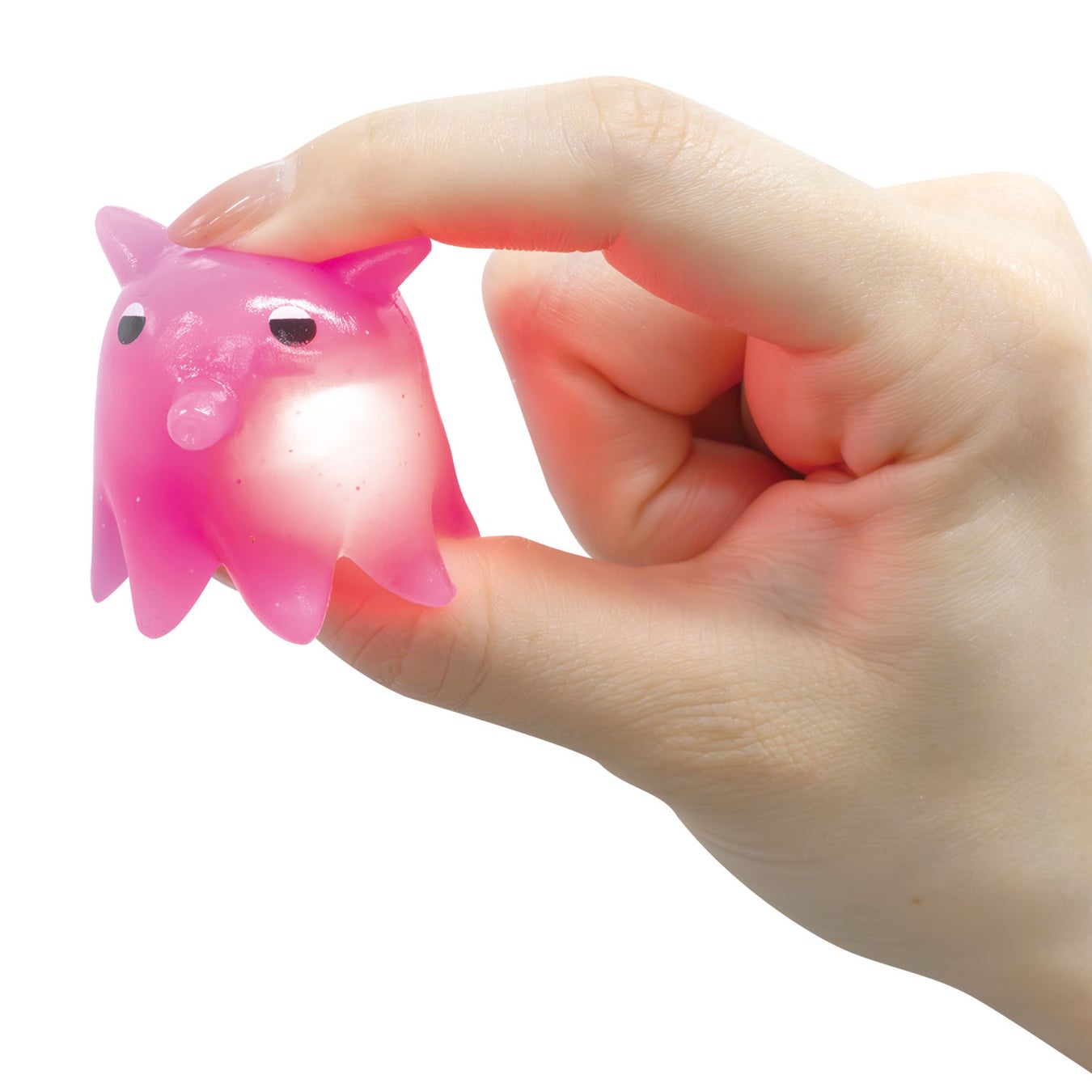 この商品は、やわらかな蓄光素材でできた光るライトマスコットで、頭を押すと3パターンの光り方で色鮮やかに輝きます。