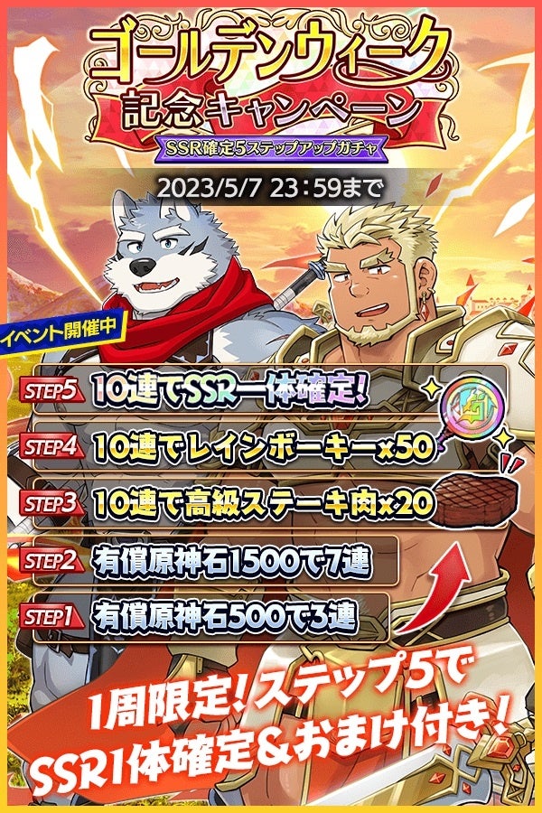 ゴールデンウィーク記念キャンペーンに合わせ、最終ステップでSSR1体確定のステップアップガチャが登場! 1周限定でステップ毎にお得な内容となっていますので、キャンペーン期間中のこの機会をお見逃しなく。
