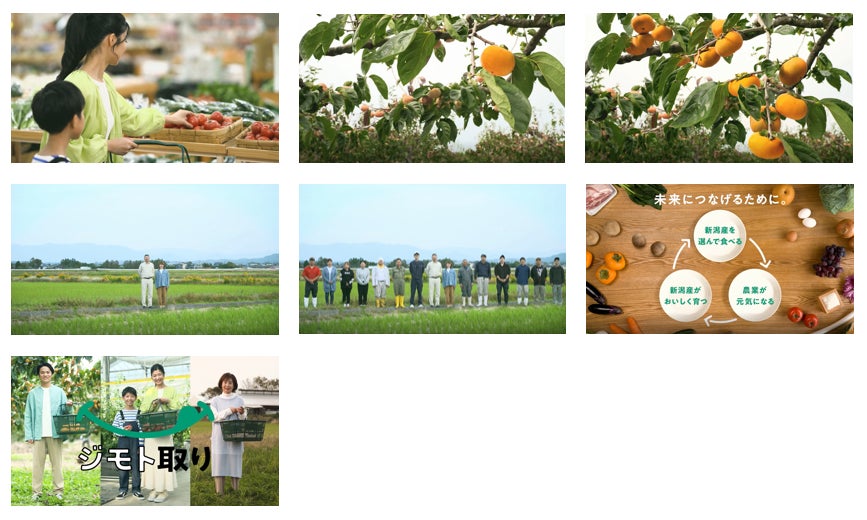 CMでは、野菜売り場で新潟産のトマトを手に取る母親や、青果売り場で新潟産の柿を手に取る若い男性、お肉売り場で新潟産の豚肉を手に取る年配の女性などが描かれています。