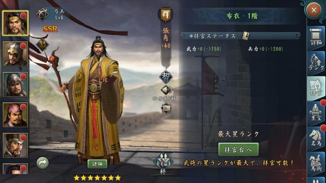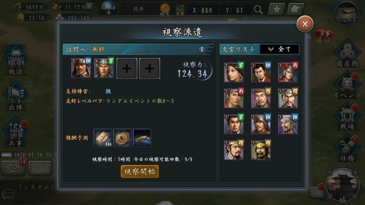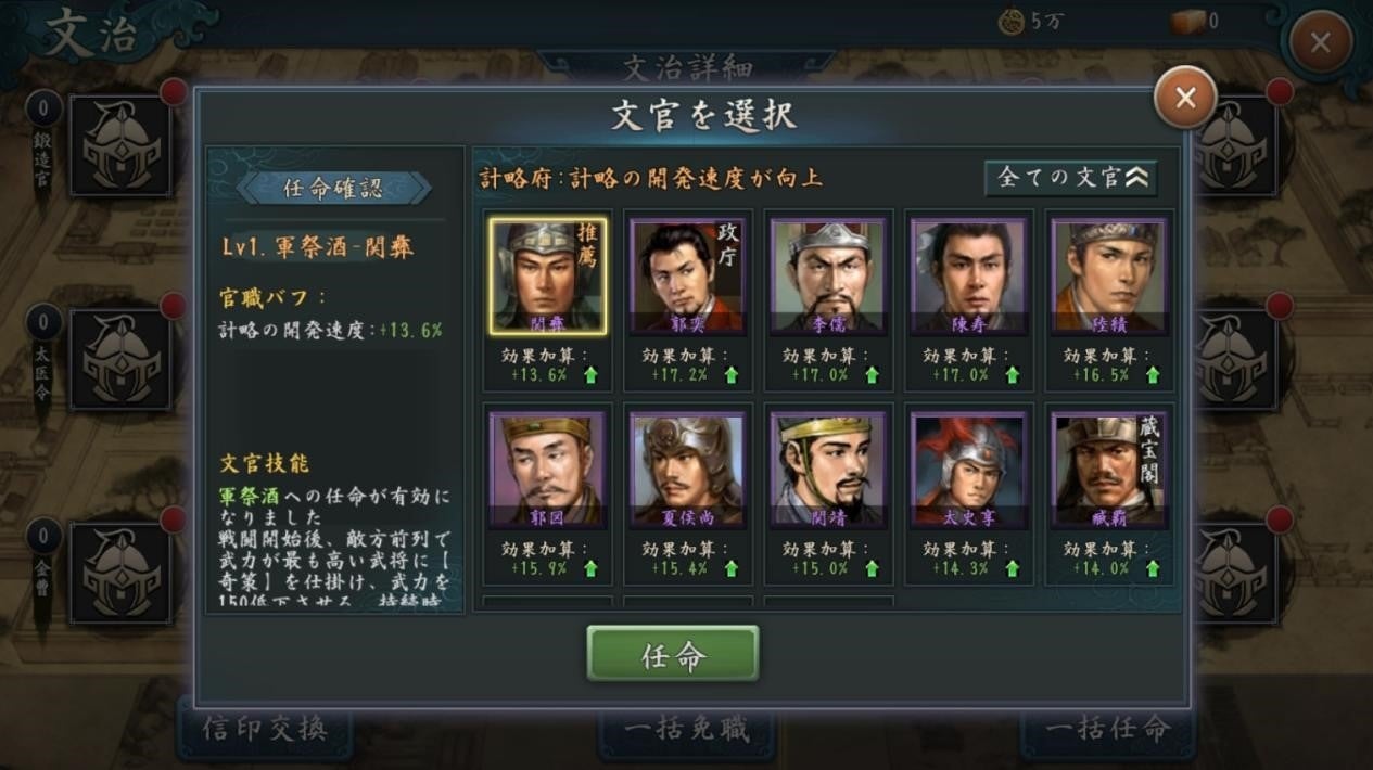 - 拝官可能武将、文官システム、新視察機能、文官、視察、使節団、任務報酬、アイテム、ログインボーナスイベント、育成型戦略シミュレーションゲーム