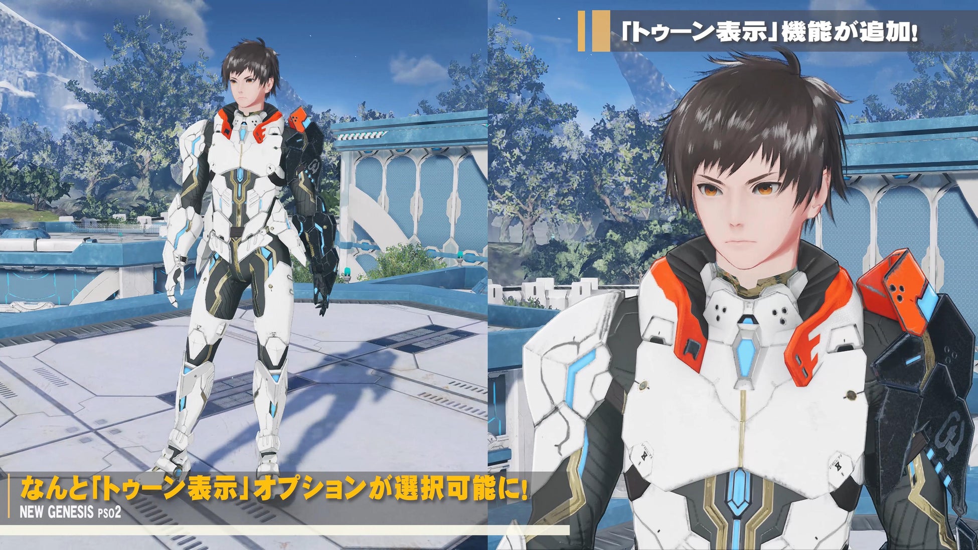 また、『PSO2』シリーズの特徴である、さまざまなコミュニケーション機能の新たな手段として、ゲーム内のどこにでも配置可能な「ポータブルホログラム」、究極のキャラクタークリエイトの新たな表現「トゥーン表示」など、オリジナルの世界をさらに進化させるさまざまな機能を紹介しています。