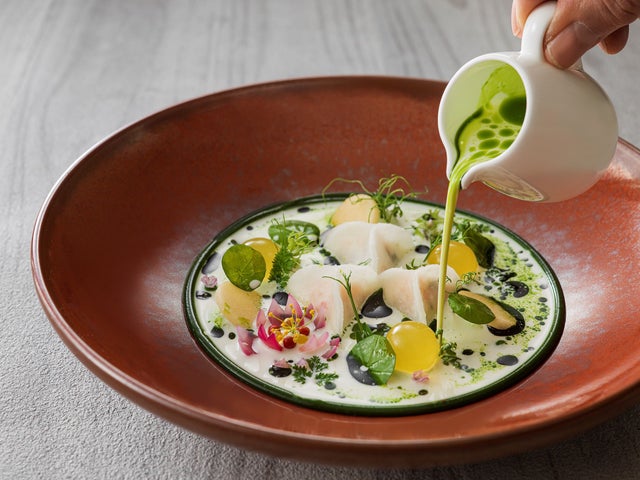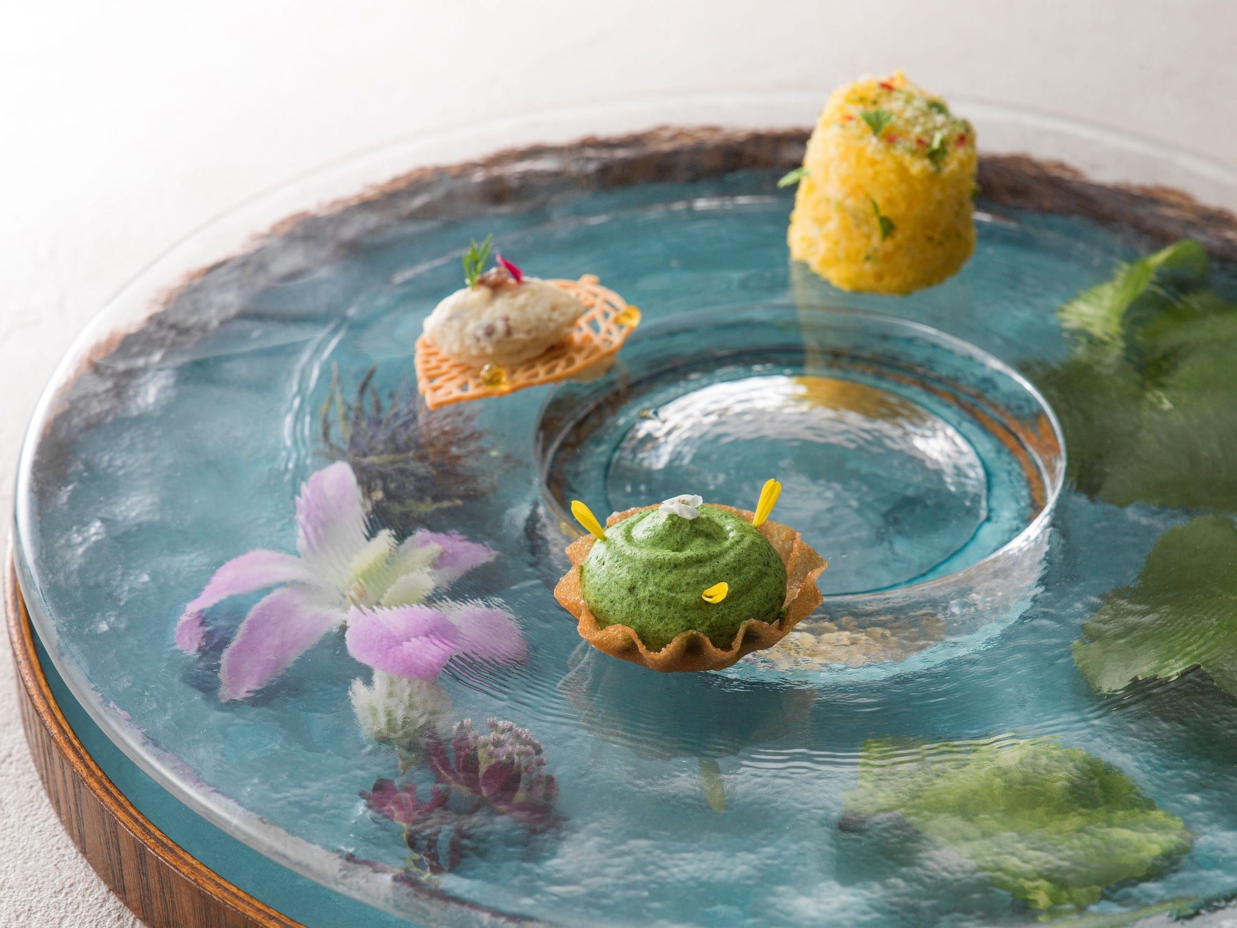 展覧会とのコラボレーションによる創作メニューでは、モネの代表作「睡蓮」をイメージしたカナッペやスイーツを楽しむことができます。