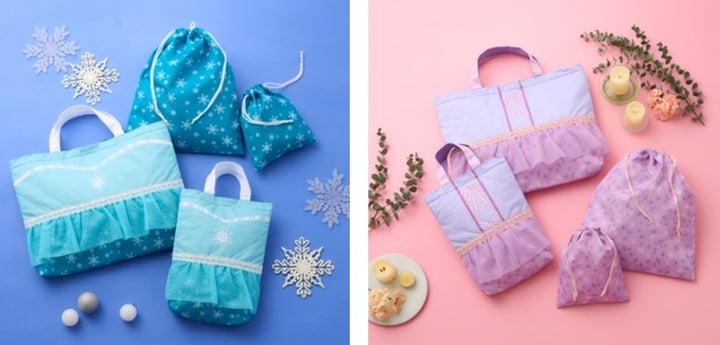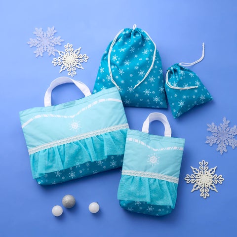 このセットは、エルサやラプンツェルのドレスをイメージした華やかなデザインで、手提げバッグやシューズバッグなど4つのアイテムが含まれています。