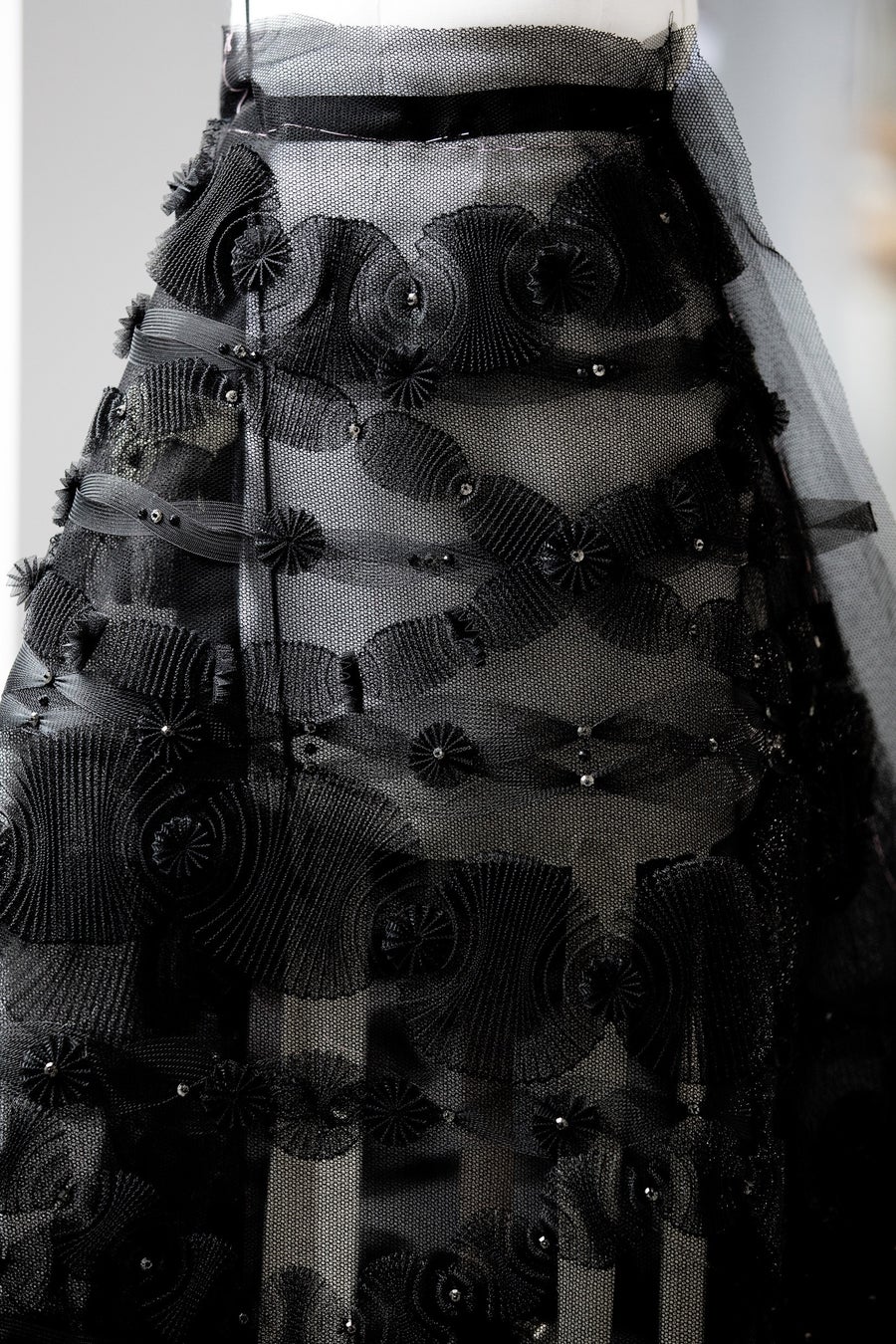 彼女は2019年春夏のオートクチュールコレクションから、アイボリーのオーガンジーのビブフロントシャツとブラックの刺繍があしらわれたロングスカートを着用しました。